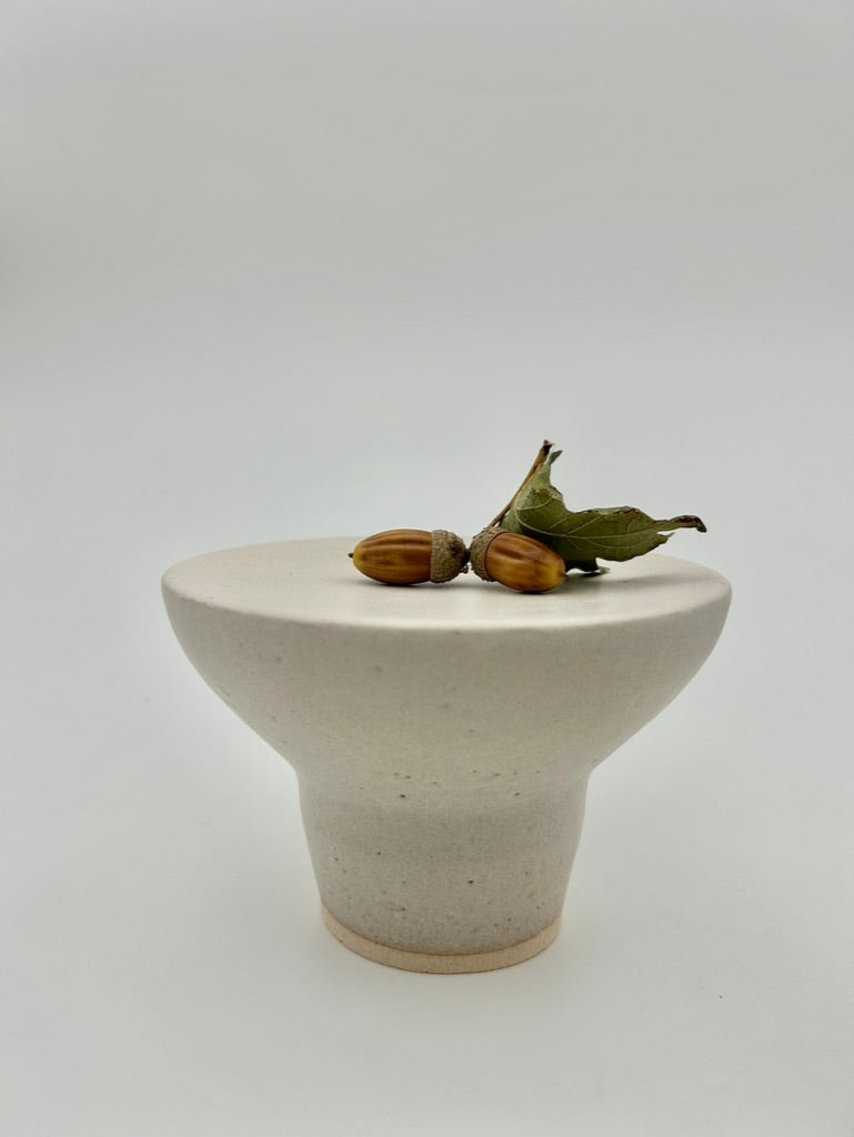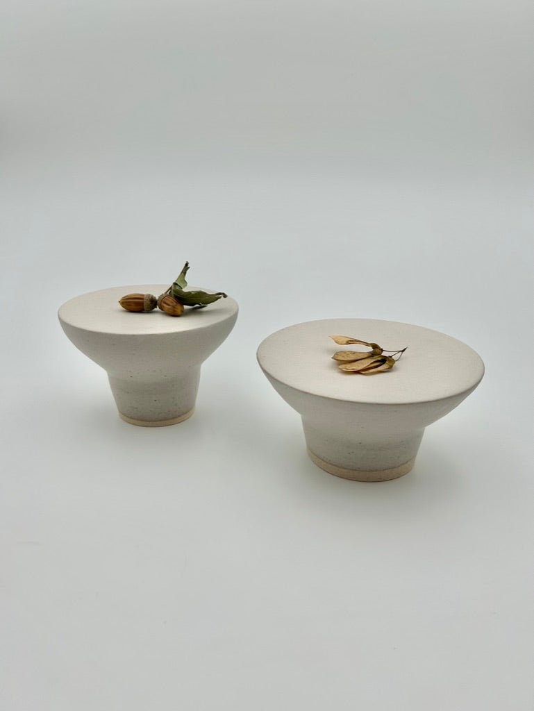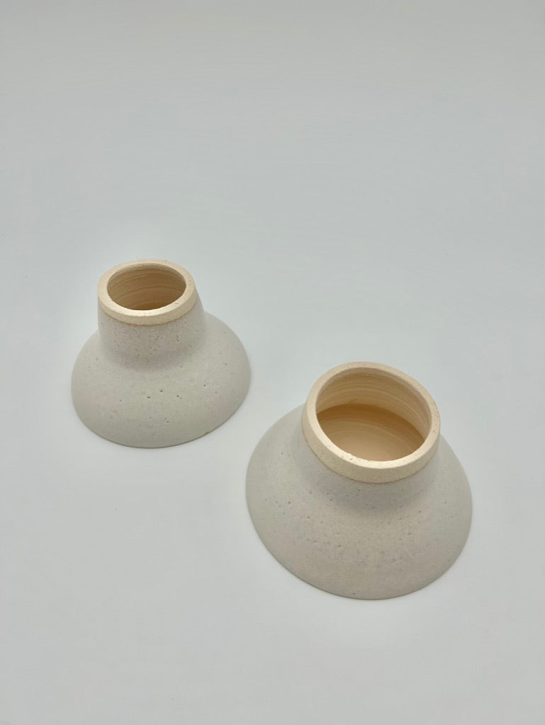 Realizzate in grès bianco, cotte ad alta temperatura smaltato chiaro opaco. Altezza 9 cm circa - diametro 13\14 centimetri.