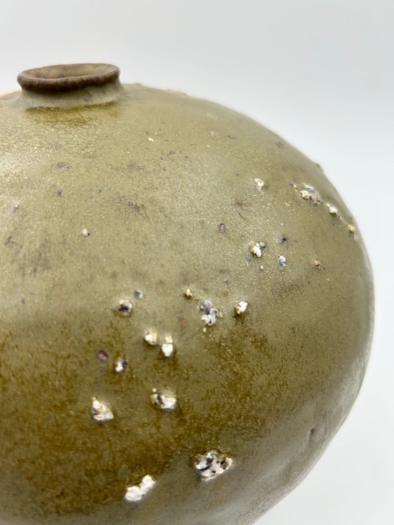 Realizzato in grès rosso cotto ad alta temperatura, smaltato con ingobbi di terre locali e aggiunta di pezzi di granito sardo raccolto a mano. Altezza 26 cm - diametro apertura 3,5 cm - diametro vaso 24 cm.